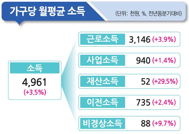 . 통계청이 8월 29일 발표한 `2024년 2분기 가계동향조사` 결과에 따르면, 가구당 월평균 소득은 496만 1,000원으로 집계됐다.