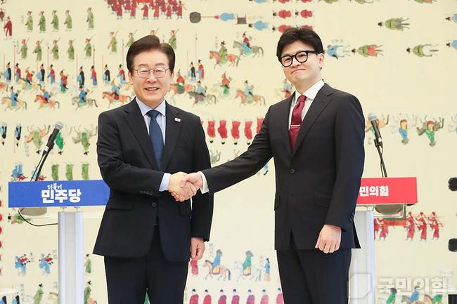 1일 오후 한동훈 당 대표와 이재명 더불어민주당 당 대표가 서울 여의도 국회 본관에서 11년 만에 `당 대표 회담`을 가졌다.
