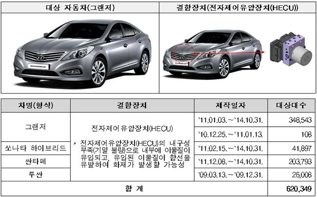 현대 그랜저 등 5개 차종 620,349대는 전자제어유압장치(HECU) 내구성 부족에 따라 화재가 발생할 가능성으로 9월 27일부터 시정조치에 들어가고, 그랜드스타렉스 201,393대는 엔진 내 부품 체결부 내구성 부족에 따라 화재가 발생할 가능성으로 9월 26일부터 시정조치에 들어간다.