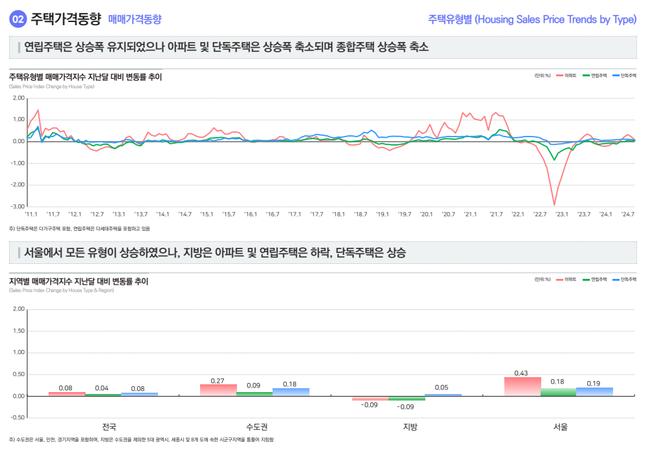 한국부동산원이 발표한 2024년 10월 전국주택가격동향조사에 따르면, 매매가격지수는 전국적으로 0.07% 상승했으며, 수도권(0.22%)과 서울(0.33%)이 상승세를 보였다.