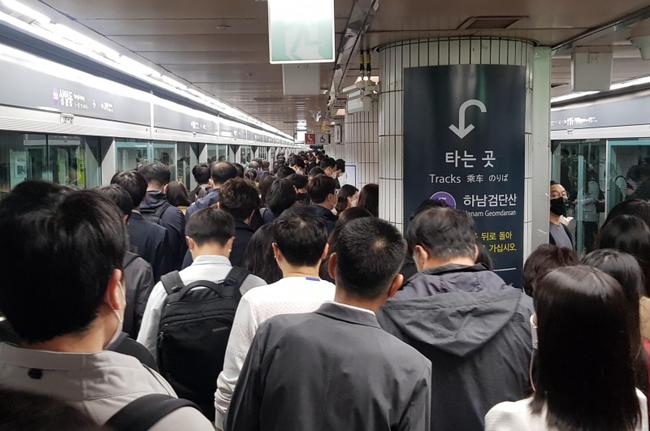 출근 시간대 승객들로 붐비는 상일동역 지하철 승강장