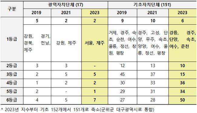 문화체육관광부는 2023 지역관광발전지수 조사 결과를 발표하며, 서울특별시와 제주특별자치도 등 2개의 광역지자체와 강릉시, 경주시, 단양군, 속초시, 여수시, 춘천시 등 6개의 기초지자체가 최우수 등급인 1등급으로 선정되었다고 밝혔다.
