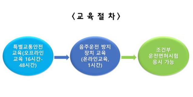 이에 한국도로교통공단은 △특별교통안전교육(오프라인 교육 16시간~48시간) △음주운전 방지 장치 교육(온라인교육, 1시간)을 의무화해 면허 취득 절차에 포함했다. 이에 따라 한국도로교통공단 서울특별시지부에서 음주운전 방지장치 부착 조건부 운전면허를 취득하려는 모든 응시자는 시험에 앞서 언급한 두 교육을 차례대로 선행 이수해야 한다.