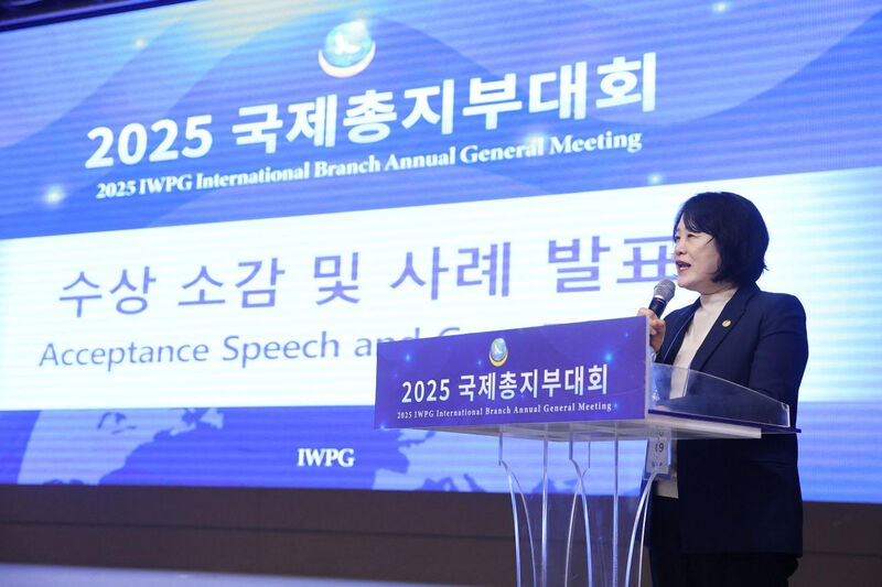 임미숙 ㈔세계여성평화그룹(IWPG) 글로벌 9국장이 21일 대구 중앙컨벤션센터에서 열린 ‘2025 국제총지부대회’에서 우수 글로벌국 수상 소감을 발표하고 있다. (제공: IWPG)