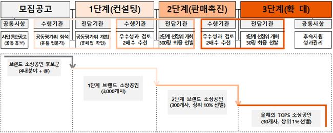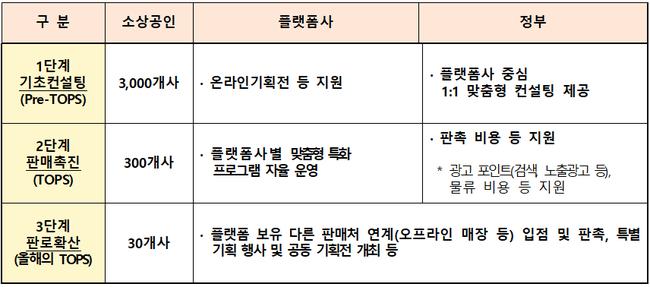지원은 총 3단계로 진행된다. 1단계(Pre-TOPS)에서는 3,000개 소상공인을 선정해 온라인 기획전과 맞춤형 컨설팅을 지원한다. 2단계(TOPS)에서는 이 중 300개사를 선별해 광고·물류비 등 판촉 비용을 지원하며, 3단계(올해의 TOPS)에서는 최종 30개사를 선정해 특별 기획전 및 오프라인 팝업스토어 입점 기회를 제공한다.