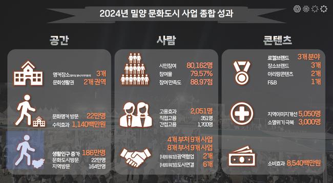 문체부는 2024년 한 해 동안 전국 24개 문화도시에서 5,239개 문화공간을 활성화해 지역주민과 방문객 약 423만 명이 문화를 향유한 성과를 평가하고, 경상남도 밀양시를 `올해의 문화도시`로 선정했다.