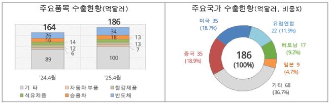 4월 초 수출 13.7% 증가… 반도체·車 수출 견인, 무역수지 11억 달러 적자 - 수출 186억 달러, 수입 197억 달러… 일평균 수출은 소폭 상승 - 반도체 수출 비중 18.3%로 확대… 對美 수출은 소폭 감소 - 에너지 수입은 감소세… 무역수지 적자폭은 전월 대비 축소