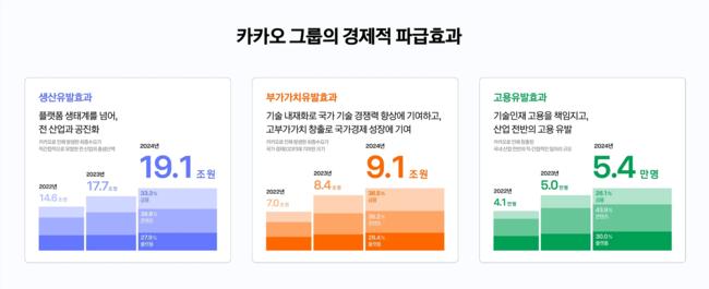 카카오, 2024년 경제효과 19.1조 원…사회경제적 기여 122개 지표로 공개 - 3년 누적 생산유발효과 51.4조 원…창작·소상공인·기부 등 다방면 기여 - 2025년엔 11개사 성과 122개 지표로 확대…이해관계자별 영향 구체화 - 권대열 ESG위원 “10대 핵심 분야 중심으로 소셜 임팩트 강화할 것”