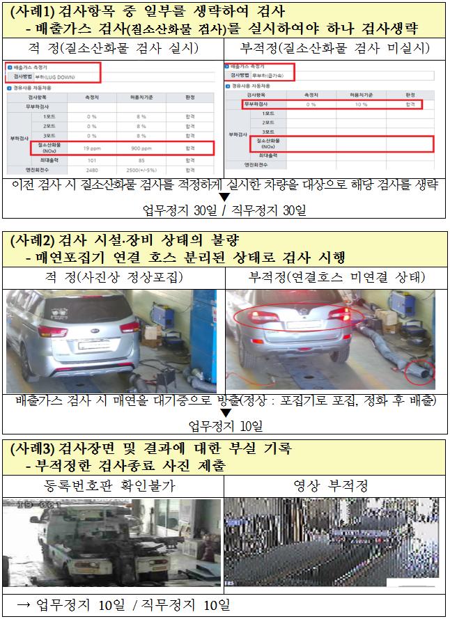 적발된 검사소에 대해서는 사안의 경중에 따라 해당 지자체가 최소 10일에서 최대 60일까지의 업무정지 처분을 내릴 수 있으며, 불법 검사에 가담한 기술인력 14명에 대해서는 직무정지 조치가 검토된다.