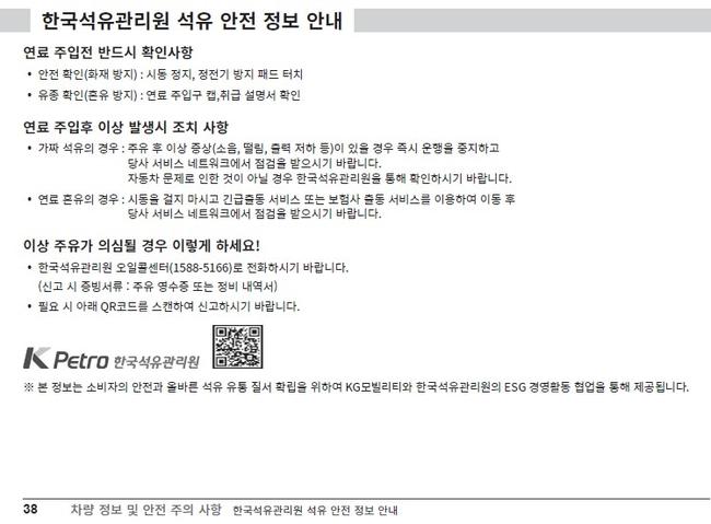 KGM은 협약에 따라 자동차(내연기관) 취급설명서(모바일 앱, 홈페이지 자료, 책자 등)에 ▲연료 주입 전 운전자 확인 요청 ▲비정상 연료 주입 후 이상 발생 시 조치 사항 ▲한국석유관리원 소비자 신고 안내(QR코드 및 오일콜센터 1588-5166) 등 사고 예방 및 위급 상황 발생 시 조치 사항을 새롭게 포함하기로 했다.