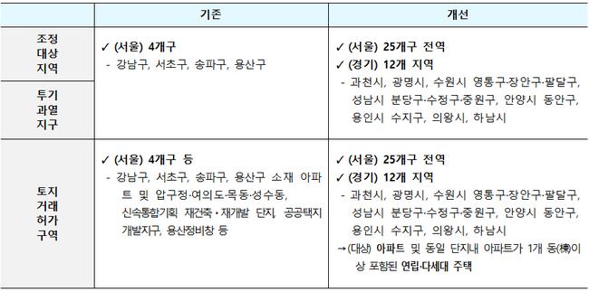 이번 대책에 따라 정부는 우선 서울 전역과 경기 12개 지역을 대상으로 조정대상지역, 투기과열지구, 토지거래허가구역을 확대 지정한다.