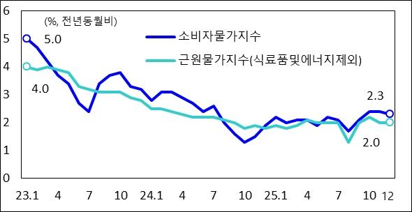 12월 물가 2.3% 상승… 농축수산물 둔화, 석유류는 6.1%↑ - 근원물가 2.0% 유지… 생활물가 2.8%, 신선식품 1.8%로 급락 - 연간 소비자물가 2.1%·근원 1.9%… “체감물가 안정 총력”
